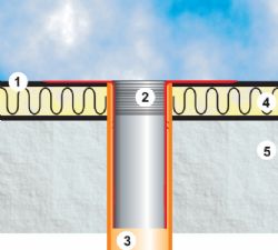 1. Membrana EPDM 2. Cazoleta EPDM sifónica 3. Tubo pluvial de desagüe 4. Panel aislante 5. Losa